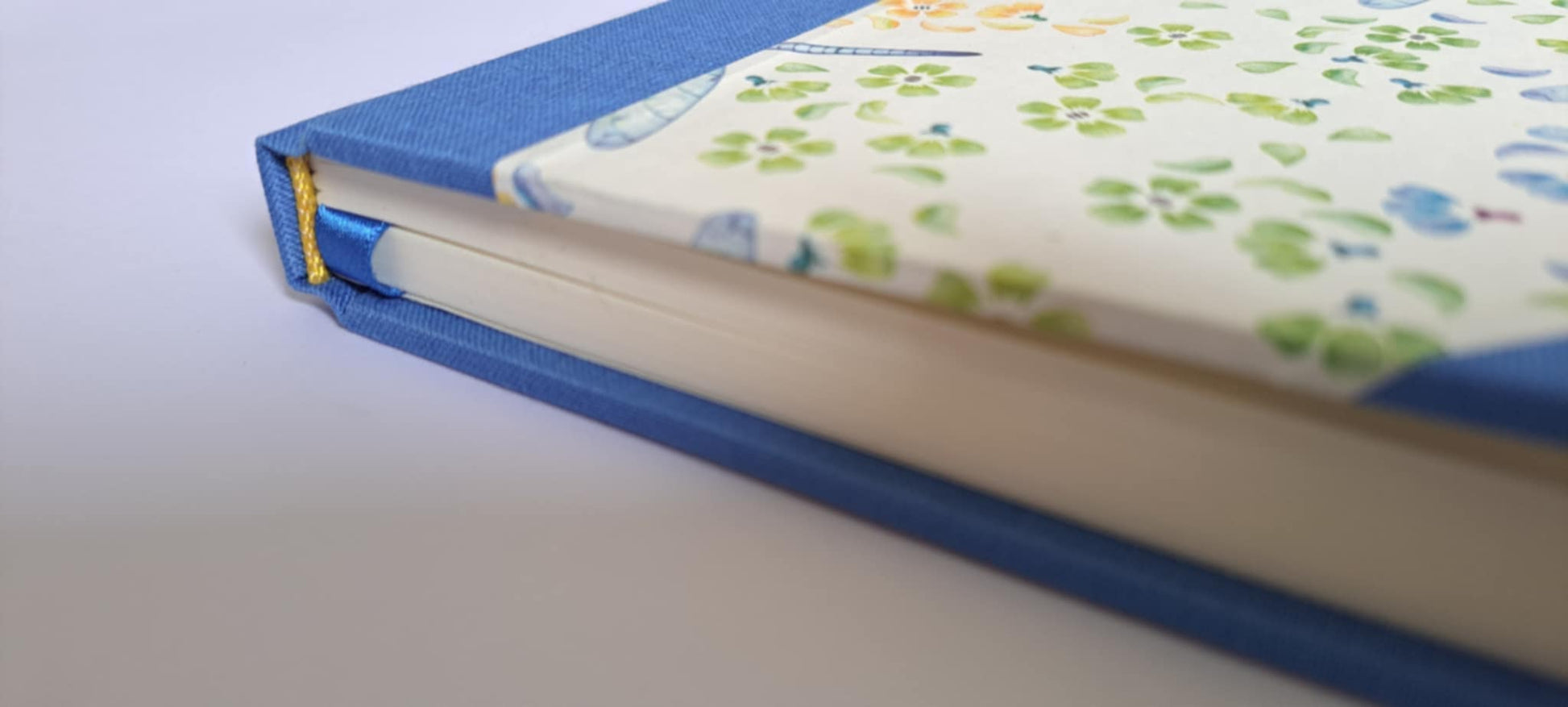 The case consists of sturdy 3mm boards covered in high-quality binding cloth with an eye catching blue half bound front cover featuring eye catching blue dragonfly design.