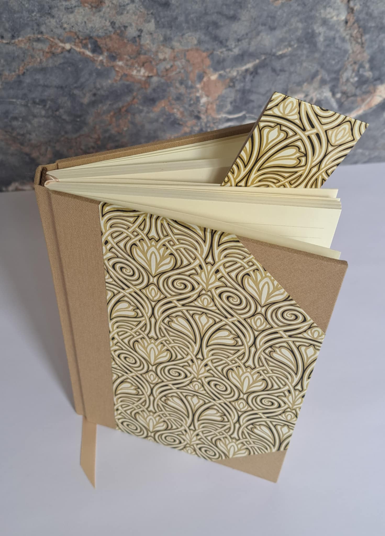 A5 Journal/Notebook (blank) - taupe/beige cloth bound with gold art deco design front cover